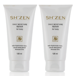 DESCRIPTION The Sh’Zen Daily Moisture Repair for body is expertly formulated to improve the look and feel of your skin while helping to counter the effects of sun and environmental exposure. This superb, lightweight deodorising lotion absorbs easily, leaving skin nourished and silky soft. INGREDIENTS • Hyaluronic Acid provides deep hydration and supports moisture retention, helping to strengthen the skin’s natural barrier. • Carrot oil is rich in beta-carotene and vitamins that help nourish, soften and smooth skin. • Calendula oil is renowned for its soothing and softening qualities, making it perfect for calming dry, itchy skin conditions. • Almond oil is deeply nourishing and vitamin-rich, helping to soften and smooth skin. • Wheatgerm is naturally rich in healing Vitamin E, which may help protect skin and support repair and renewal, especially for dry or sun-damaged skin conditions. • Coltsfoot has traditionally been used as a deodorising agent to help purify and reduce odour, supporting long-lasting freshness. • Oak Bark is rich in tannins that calm, soothe and purify skin, reducing the bacteria associated with perspiration odour. APPLICATION After bathing or showering, dry your body well and vigorously to stimulate circulation. Then massage skin from neck to feet with the Daily Moisture Repair cream. It is absorbed quickly, giving skin a silky finish without leaving a residue on the skin. Use daily for maximum benefit. COMPLEMENTARY PRODUCTS • Any Sh’Zen Cleansing Gel • Any Sh’Zen Body Powder PACKAGING 125ml white tube RESULT A nourished and well-moisturised body.