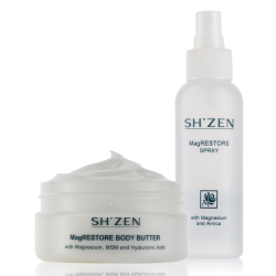 Magnesium B/Butter escription This rich body butter deeply hydrates and nourishes, soothes tired muscles, and helps your body and mind feel relaxed and restored. It supports skin repair and resilience, leaves skin soft and smooth, and the calming natural blend eases stress and restores balance. Key Benefits Zechstein Magnesium is sourced from an ancient underground seabed and prized for its purity and bioavailability. It is a premium, transdermal form of magnesium that absorbs easily into the skin to help relieve muscular tension, support post-exercise recovery, ease cramps, and deeply relax the body. Arnica is traditionally used to ease swelling, bruising, muscular pain, and discomfort. MSM supports connective tissue health, skin repair and elasticity, and helps reduce inflammation in overworked muscles. Hyaluronic Acid delivers deep hydration, improving smoothness, comfort, and resilience. Shea Butter intensely nourishes, softens, and protects, helping restore dry, stressed skin. Sweet Almond Oil soothes and conditions, helping to improve skin elasticity and suppleness. Coconut Oil moisturises and supports the skin barrier, helping prevent moisture loss. Vitamin E provides antioxidant protection and supports skin recovery. Marjoram is traditionally used as a natural sedative and muscle relaxant, helping ease tension and support rest. Lavender calms the nervous system, eases stress and tension, and supports skin healing and repair. Cedarwood is grounding and stabilising, helping reduce nervous tension while supporting irritated or inflamed skin. Ylang Ylang, Petitgrain & Clary Sage help regulate the nervous system, ease emotional stress and promote a sense of calm and wellbeing. How To Use Apply generously after bathing onto damp, warm skin for maximum benefit. MagRestore Spray Description This potent magnesium-based spray is easily absorbed through the skin to help replenish magnesium levels and support whole-body wellness. Infused with high levels of Magnesium, Arnica, and six restorative essential oils, it works synergistically to promote deep relaxation, muscle recovery, and restful sleep. Key Benefits Magnesium is known to support muscle and nerve function, helping to ease muscular aches and pains while promoting better sleep, mood, and energy levels. Arnica helps stimulate the immune system to relieve swelling, bruising and pain, and clear fungal and bacterial infections. Marjoram is a natural sedative, helping to alleviate insomnia. It is also rich in antioxidants, including phenolic compounds and flavonoids, which help protect and nourish skin. Lavender is deeply calming and rebalancing, helping to relieve feelings of anxiety, depression and stress. It helps to tone and revitalise skin, healing damaged tissue and preventing scarring. Cedarwood offers calming properties that reduce stress and promote relaxation. Its antiseptic and anti-inflammatory qualities can benefit the skin, while its woody scent supports respiratory health and acts as a natural deodoriser. Ylang-Ylang, Petitgrain, and Clary Sage uplift and calm the mind, helping to relieve stress, soothe, rebalance and regulate the nervous system. How To Use Spray onto feet, legs, or body to soothe aches, cramps, or bruising and to boost serotonin production and support a more relaxed body naturally.